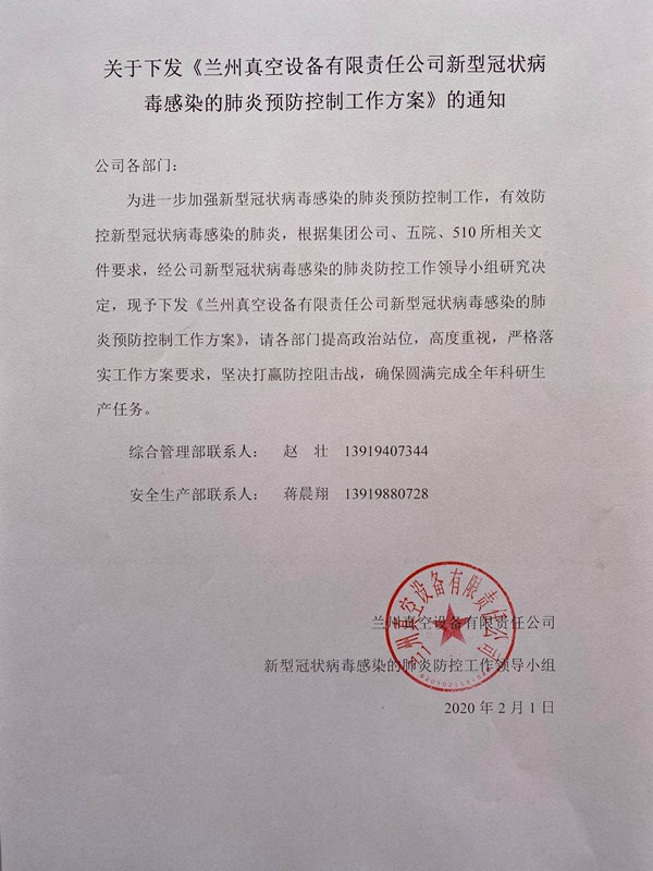接到新型冠狀病毒感染的肺炎疫情防控工作要求的第一時(shí)間,他們便趕到公司,制定下發(fā)了公司《關(guān)于進(jìn)一步加強(qiáng)新型冠狀病毒感染的肺炎預(yù)防控制工作的緊急通知》,成立了公司“新型冠狀病毒感染的肺炎防控工作領(lǐng)導(dǎo)小組”,擔(dān)負(fù)起了防控小組的主要日常工作,為保障假日期間信息渠道通暢,兩個(gè)人的手機(jī)24小時(shí)保持開(kāi)機(jī)暢通狀態(tài),隨時(shí)處理各方面的信息,除了認(rèn)真收集、匯總信息外,兩位同志還在2月1日制定下發(fā)了《蘭州真空新型冠狀病毒感染的肺炎預(yù)防控制工作方案》,為公司疫情防控工作提供了制度保障。